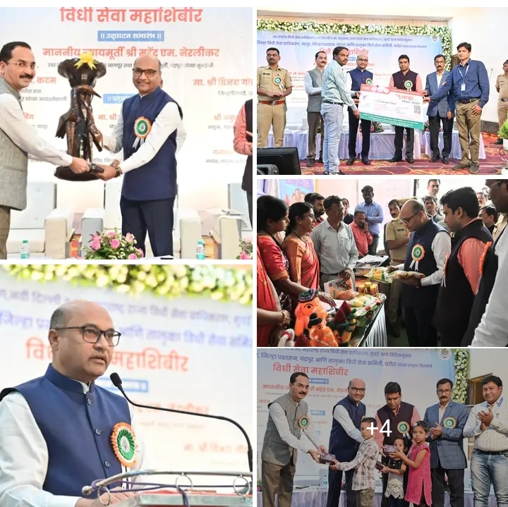 1) चंद्रपुर, के वरोरा में सरकारी योजनाओं का महा सिविर महामेला संबंधित कानून सेवाएं भारतीय संविधान के कारण नागरिक अपने अधिकारों के प्रति जागरूक हो रहे हैं। हालांकि, इन अधिकारों का प्रयोग कैसे किया जाए, यह जानकारी अभी तक पूरी तरह से नागरिकों तक नहीं पहुंची है। इसीलिए कानूनी सेवाओं का उपयोग अत्यंत महत्वपूर्ण है। बॉम्बे उच्च न्यायालय, नागपुर बेंच के न्यायाधीश और चंद्रपुर जिले के संरक्षक न्यायाधीश न्यायमूर्ति महेंद्र नेरलिकर ने कहा कि नि:शुल्क कानूनी सेवाओं के माध्यम से अंतिम वर्ग तक न्याय पहुंचाना हमारा कर्तव्य है।