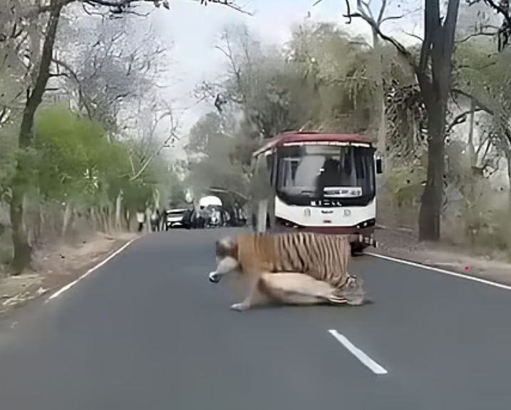 सड़क पर अचानक बाघ के प्रकट होने से राजमार्ग पर यातायात कुछ देर के लिए रुक गया। एसटी बसें, चार पहिया वाहन और दो पहिया वाहन सुरक्षित दूरी बनाए रखते हुए रुक गए। सभी लोग दूर से इस रोमांचक दृश्य को देख रहे थे। बाघ ने जिस बैल का शांतिपूर्वक शिकार किया था, वह सड़क पार करके जंगल की ओर भाग गया।