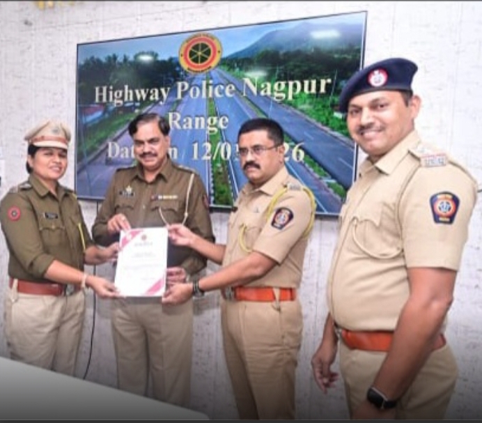 लक्षधे- माननीय पुलिस अधीक्षक, राजमार्ग पुलिस क्षेत्रीय प्रभाग, नागपुर ने पूरे राजमार्ग के कार्यों और मामलों की समीक्षा करने के बाद, वर्ष 2025-26 में सर्वश्रेष्ठ और उत्कृष्ट कार्य के लिए चंद्रपुर राजमार्ग पुलिस की प्रभारी अधिकारी माया चैटसे को प्रथम पुरस्कार और प्रमाण पत्र प्रदान किया।
